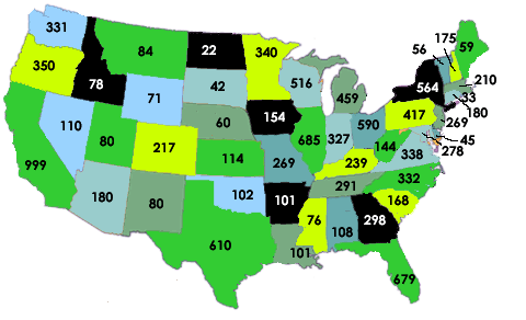 This map shows by state how many equine boarding stables are in our database.